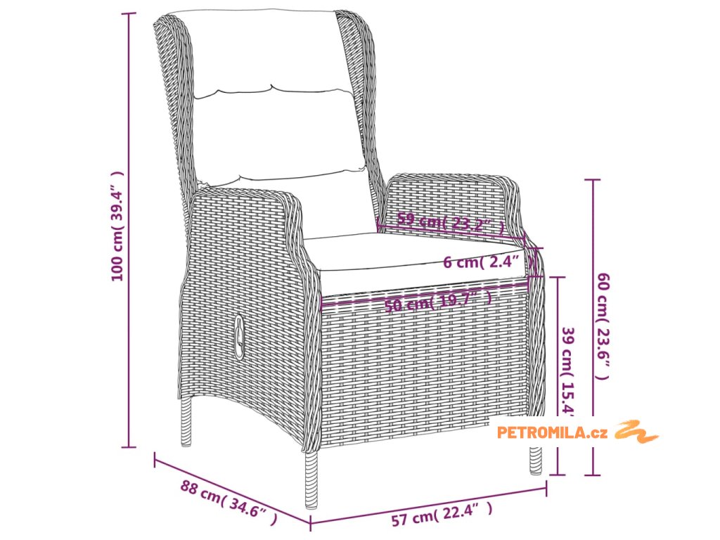- Rozměry křesla (nesklopeného): 57 x 88 x 100 cm (Š x H x V)