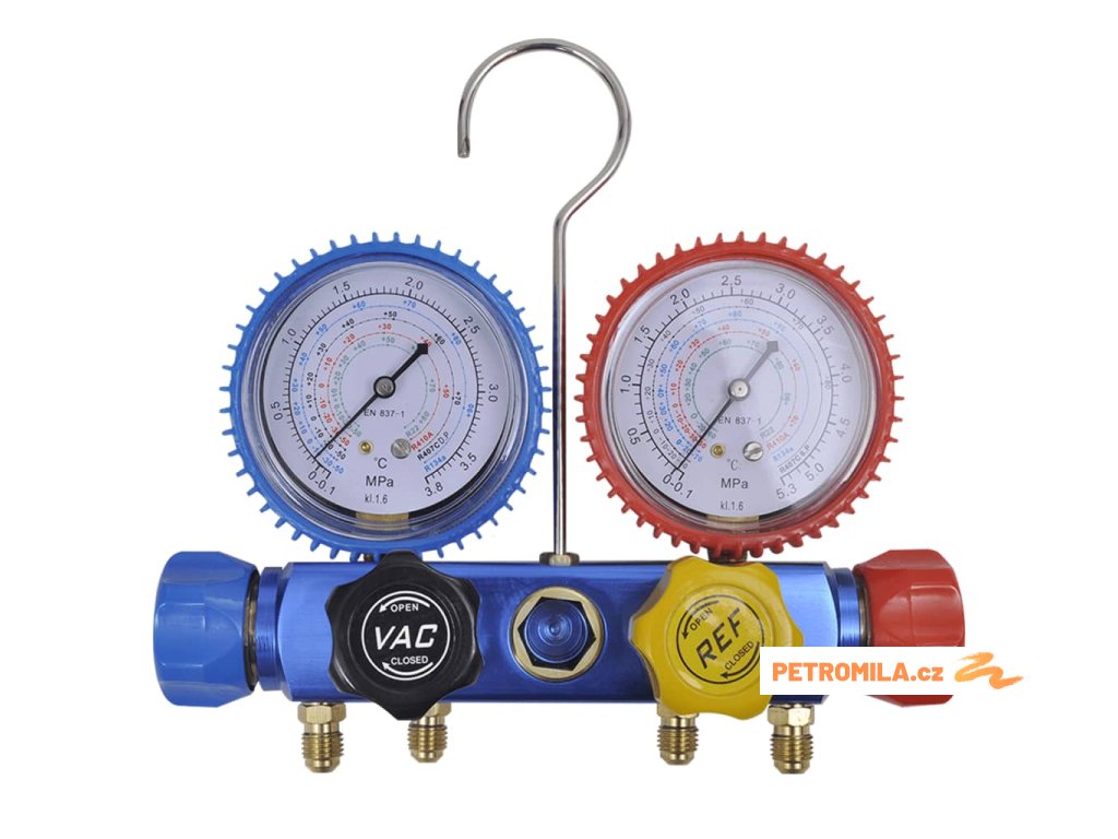 Distributor pro rychlosti klimatizací slouží k plnění a kontrolu klimatizačních systémů tím, že tlak v systému měření Je vhodný pro použití na všech autech A / Cs , stejně jako pro komerční a domácí chladicí systémy A / C .Barevně odlišené měřidla jsou rychlé, přehledné a snadno čitelné. Měřidla jsou uzavřeny v ochranném nárazníku , aby se zabránilo poškození . Můžete použít integrovaný ocelový hák snadno a rychle pozastavit měřidla . Směrné potrubí měřidlo soubor má odolnou konstrukci.