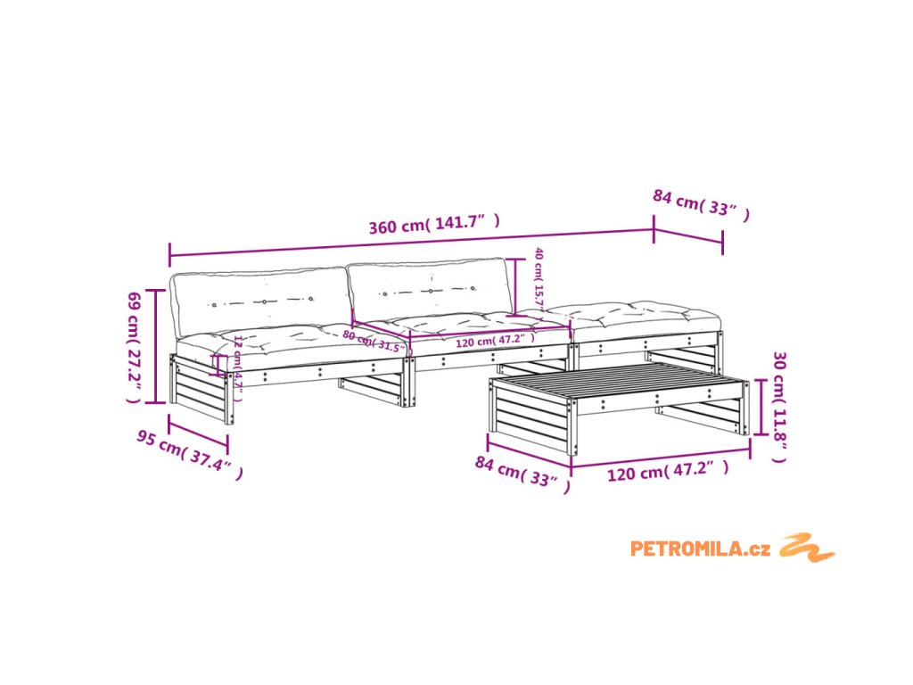 - Rozměry středové pohovky: 120 x 95 x 69 cm (D x Š x V)