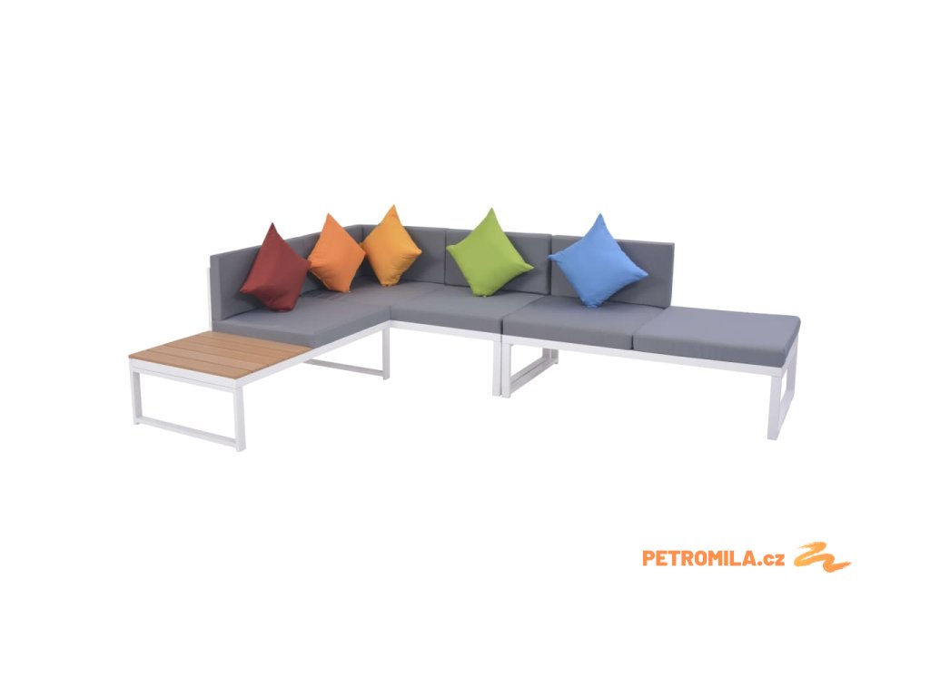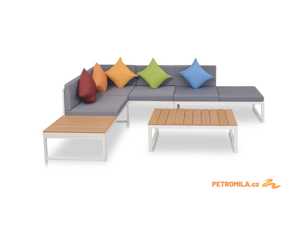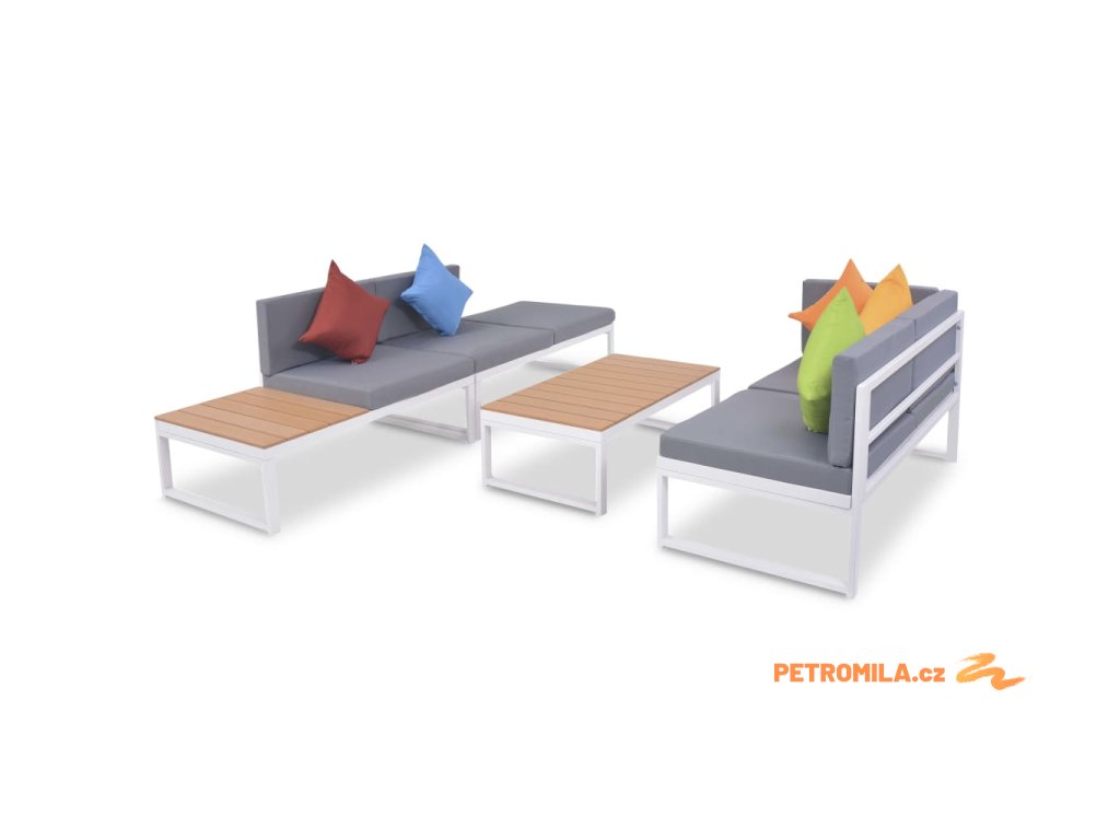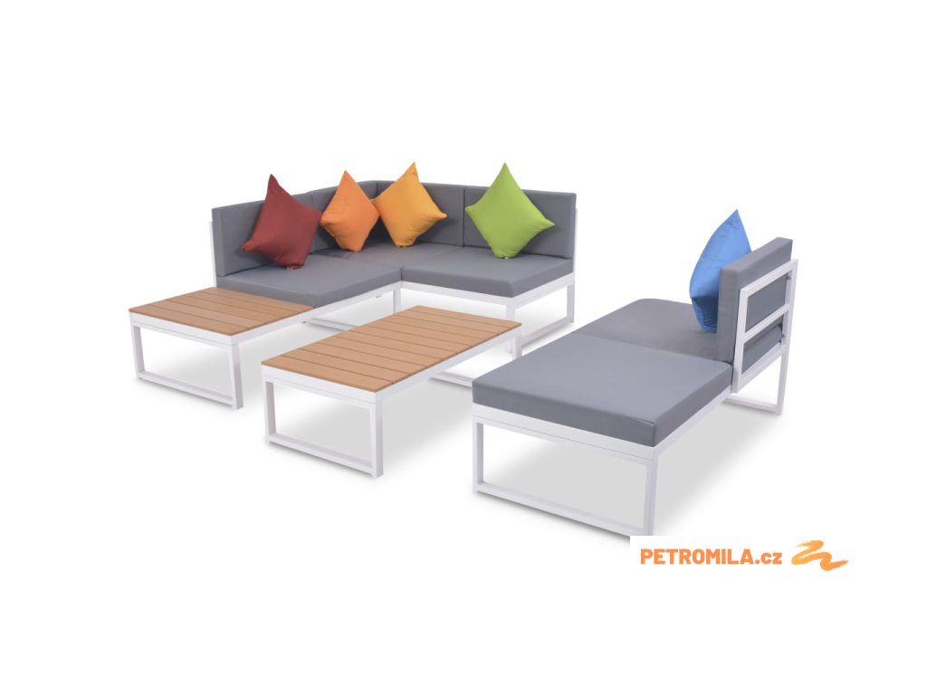 Balení obsahuje 2místní pohovku bez opěrek, 2místnou pohovku (polovina s WPC sedadlem), 2místní rohovou pohovku, konferenční stolek, pět polštářů, pět sedáků a pět polštářů za záda.