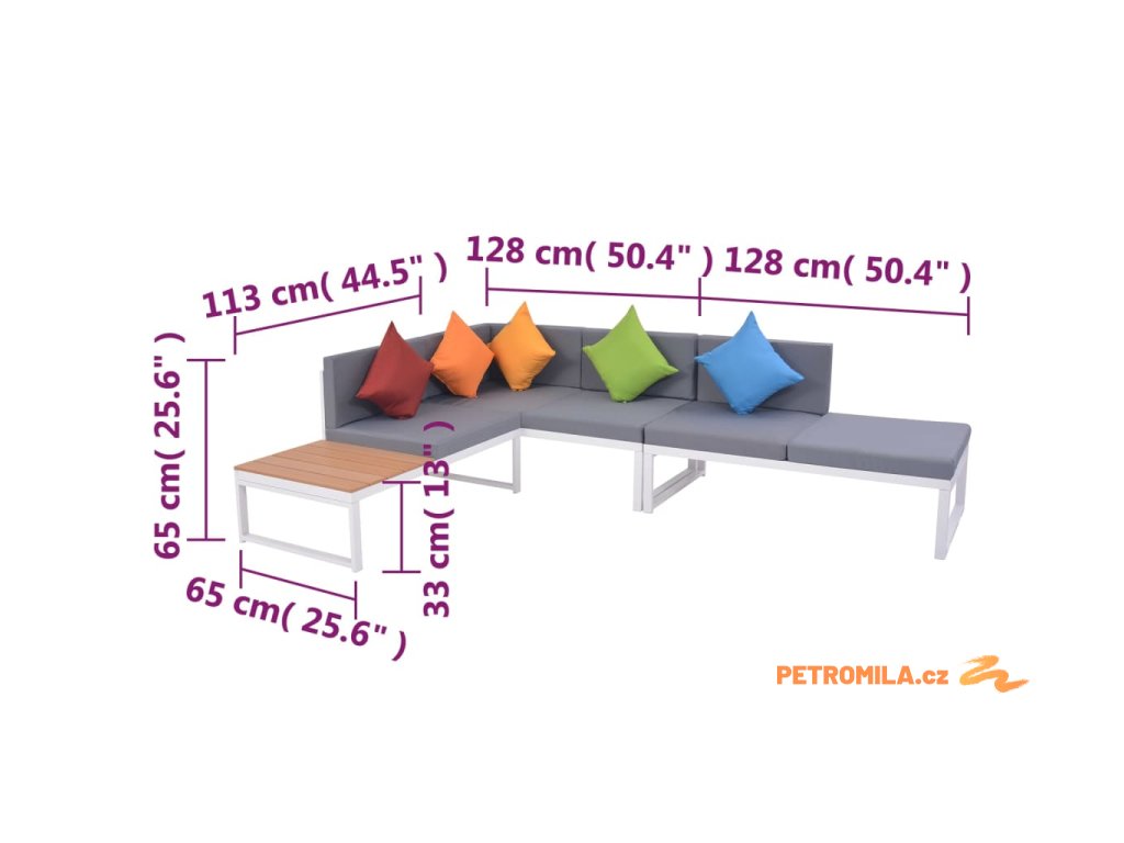 - Rozměry dvoumístní pohovky (polovina se sedadlem z WPC): 113 x 66 x 65 cm (Š x H x V)
