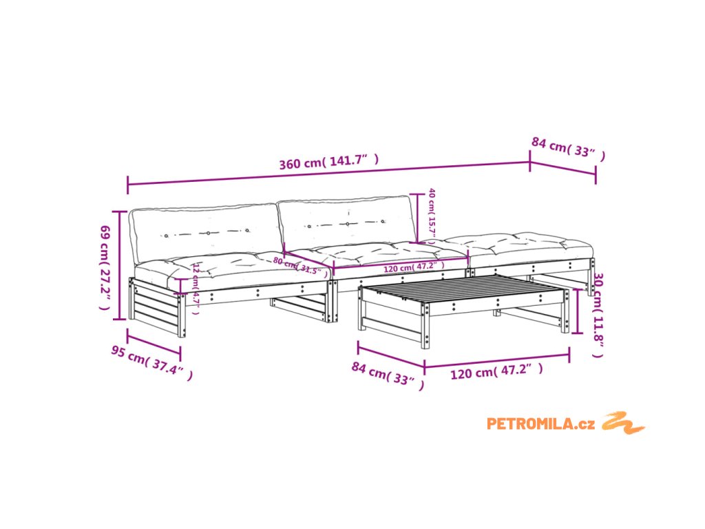 - Rozměry středové pohovky: 120 x 95 x 69 cm (D x Š x V)