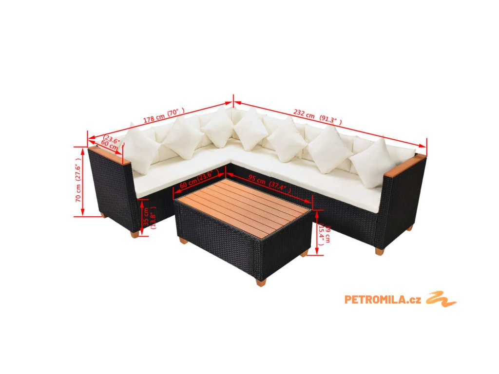 Dodávka zahrnuje dva 2místné pohovkové segmenty (každý s jednou područkou), jeden rohový segment pohovky, jeden konferenční stolek, sedm polštářů, sedm polstrů na opěradla a tři polstry na sedáky. Poznámka: Doporučujeme soupravu za deště, sněhu a mrazu přikrýt.