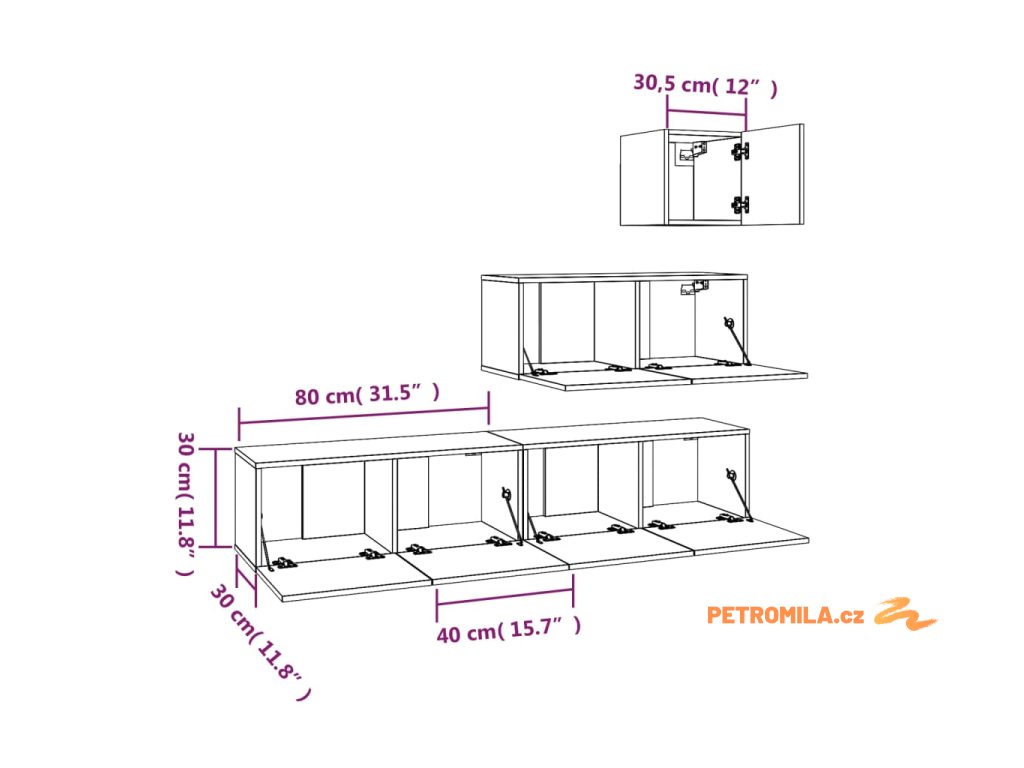 - Rozměry dolní TV skříňky (každý kus): 80 x 30 x 30 cm (Š x H x V)