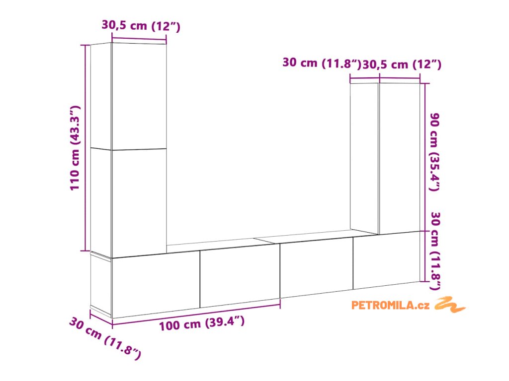- 1x TV skříňka: 30,5 x 30 x 110 cm (D x Š x V)