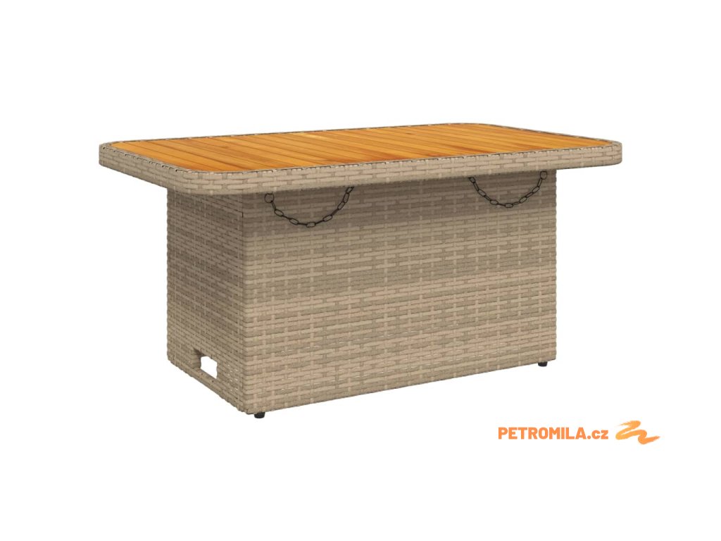 - Materiál: PE ratan, práškově lakovaná ocel, masivní akáciové dřevo s olejovou povrchovou úpravou
