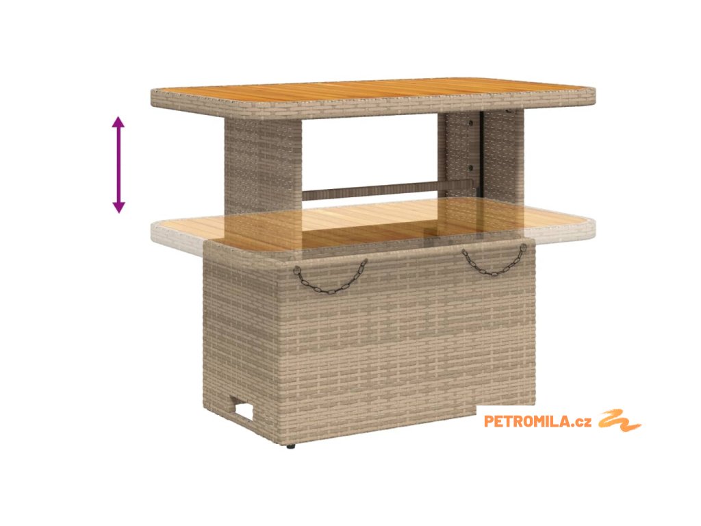 - Nastavitelná deska stolu: Stolní desku lze zvednout tak, aby stůl byl vyšší, takže jej můžete přeměnit z konferenčního stolku na jídelní. Skvěle se hodí pro návštěvy nebo pro stolování venku.