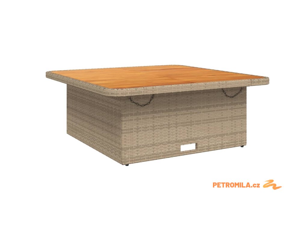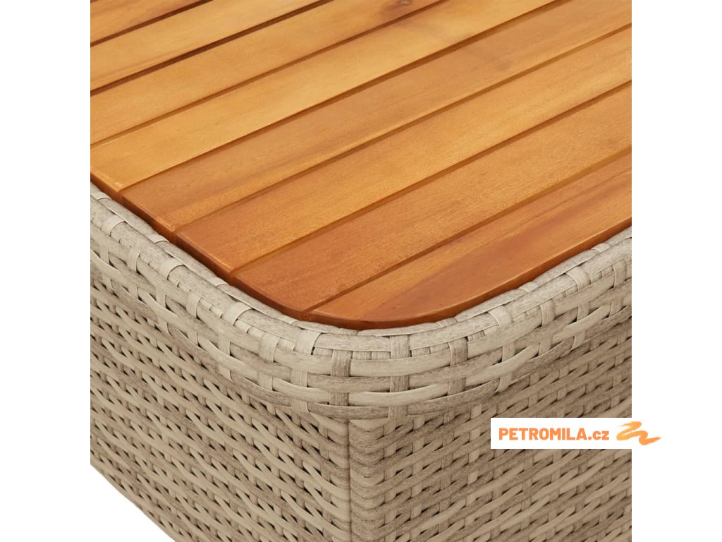- Materiál: PE ratan, práškově lakovaná ocel, masivní akáciové dřevo s olejovou povrchovou úpravou