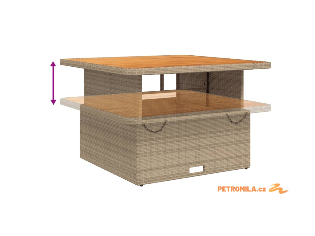 - Nastavitelná deska stolu: Stolní desku lze zvednout tak, aby stůl byl vyšší, takže jej můžete přeměnit z konferenčního stolku na jídelní. Skvěle se hodí pro návštěvy nebo pro stolování venku.