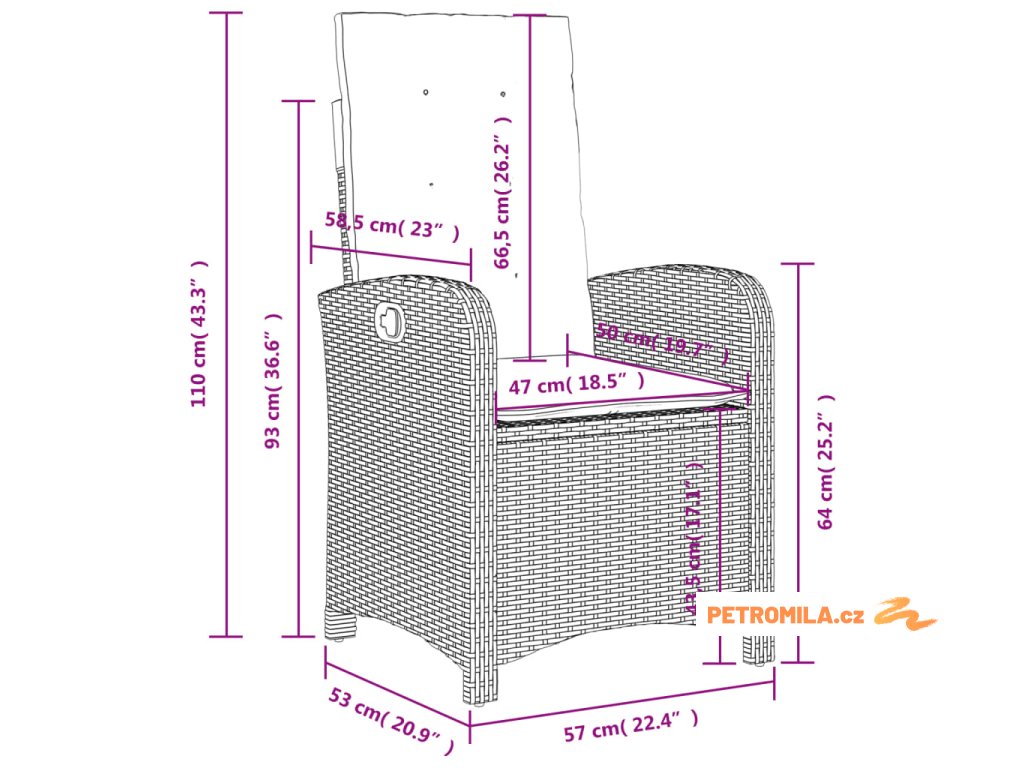 - Rozměry při poloze vsedě: 57 x 58,5 x 93 cm (Š x H x V)