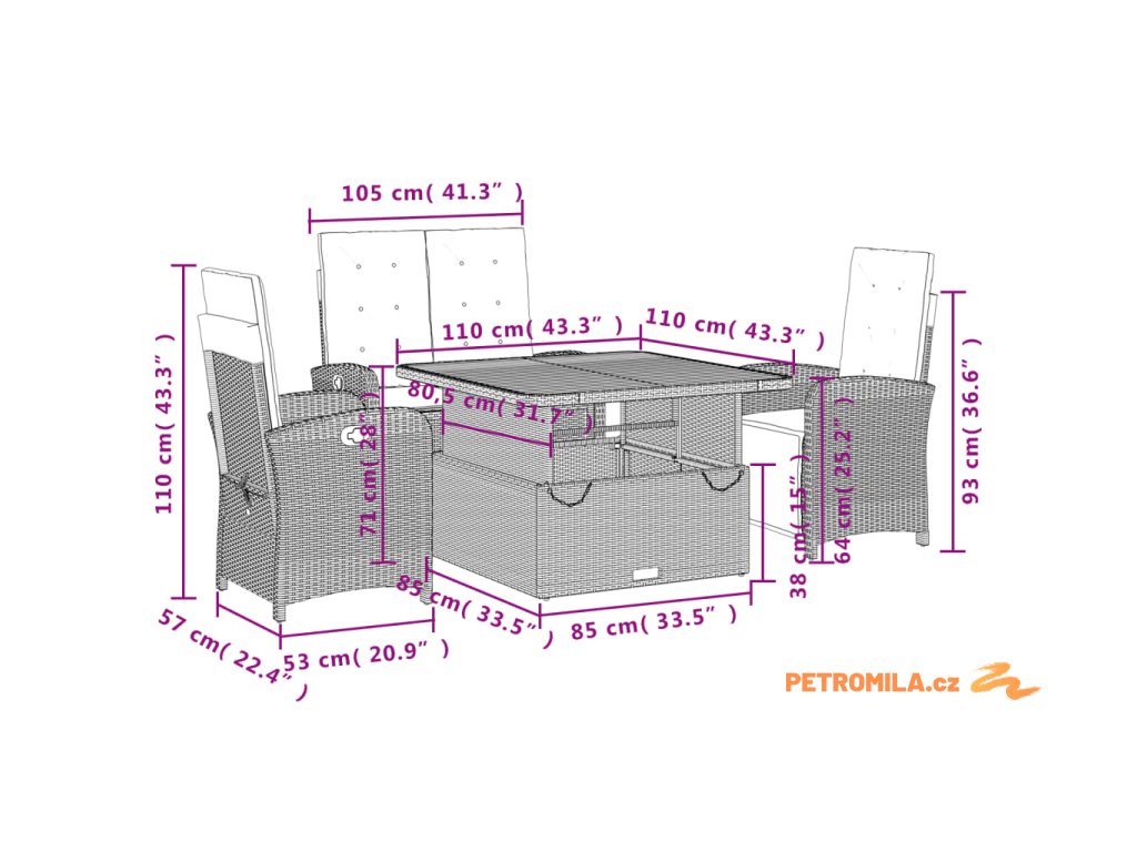 - Rozměry stolku: 110 x 110 x 40/71 cm (D x Š x V)