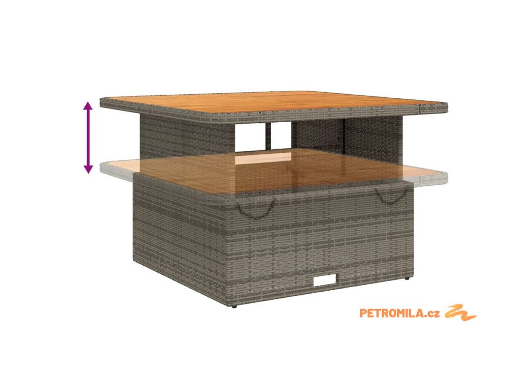 - Nastavitelná deska stolu: Stolní desku lze zvednout tak, aby stůl byl vyšší, takže jej můžete přeměnit z konferenčního stolku na jídelní. Skvěle se hodí pro návštěvy nebo pro stolování venku.