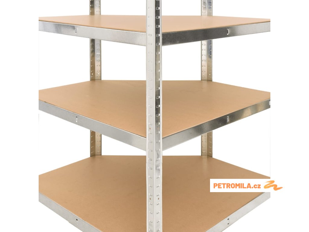 - Vysoká nosnost: Vzhledem k silnému materiálu, výztužným tyčím pod každou policí a konstrukci bezšroubových polic má regál výjimečně vysokou nosnost.