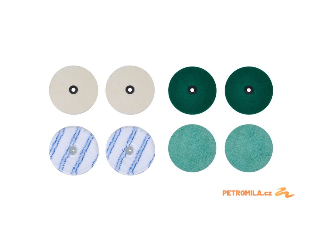 2 ks čistících kartáčů drhnou povrchy jako beton, kámen a odstraní hluboce zažrané skvrny z koberců. 2 ks leštících disků můžete používat na hladké moderní povrchy. 2 ks čepiček jsou určeny k odstranění nečistot z citlivých oblastí, jako je měkčí dřevo a lakovaný povrch. 2 ks drátěnky odstraní zaschlé skvrny z tvrdých moderních podlahových povrchů. 2 ks podušek z mikrovlákna, vyrobené ze 100% mikrovlákna, jsou účinné zejména pro čištění mramoru a kachliček.