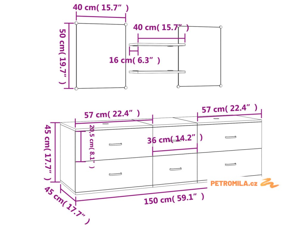 - Rozměry nástěnné skříňky pod umyvadlo: 150 x 45 x 45 cm (D x Š x V)