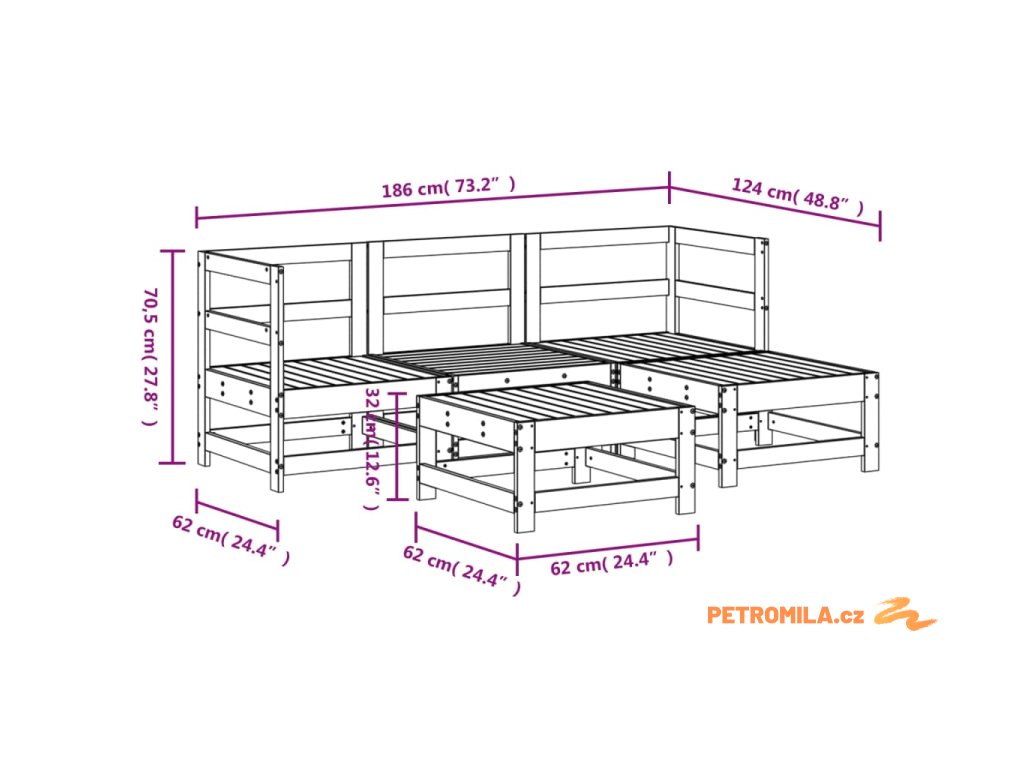 - Rozměry středové pohovky: 62 x 62 x 70,5 cm (Š x H x V)