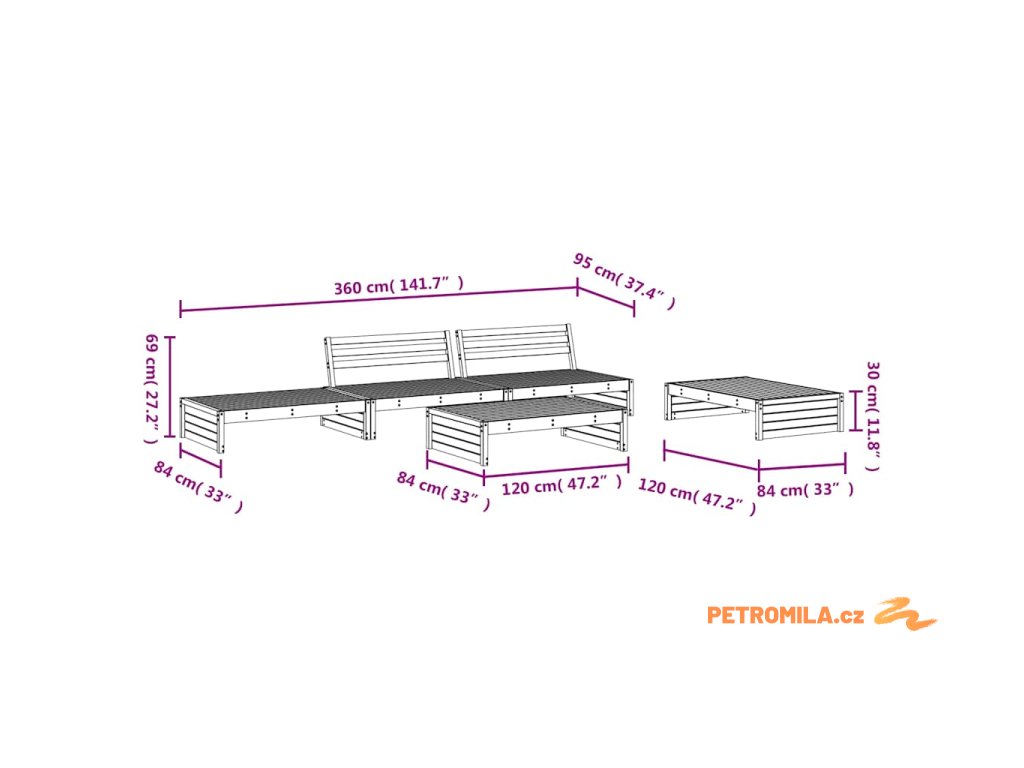 - Rozměry středové pohovky: 120 x 95 x 69 cm (D x Š x V)