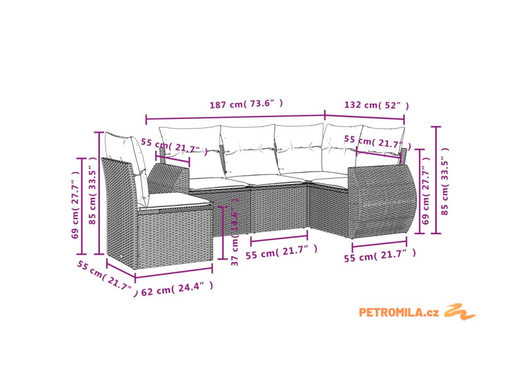 - Rozměry podušky za záda: 55 x 45 x 13 cm (D x Š x T)