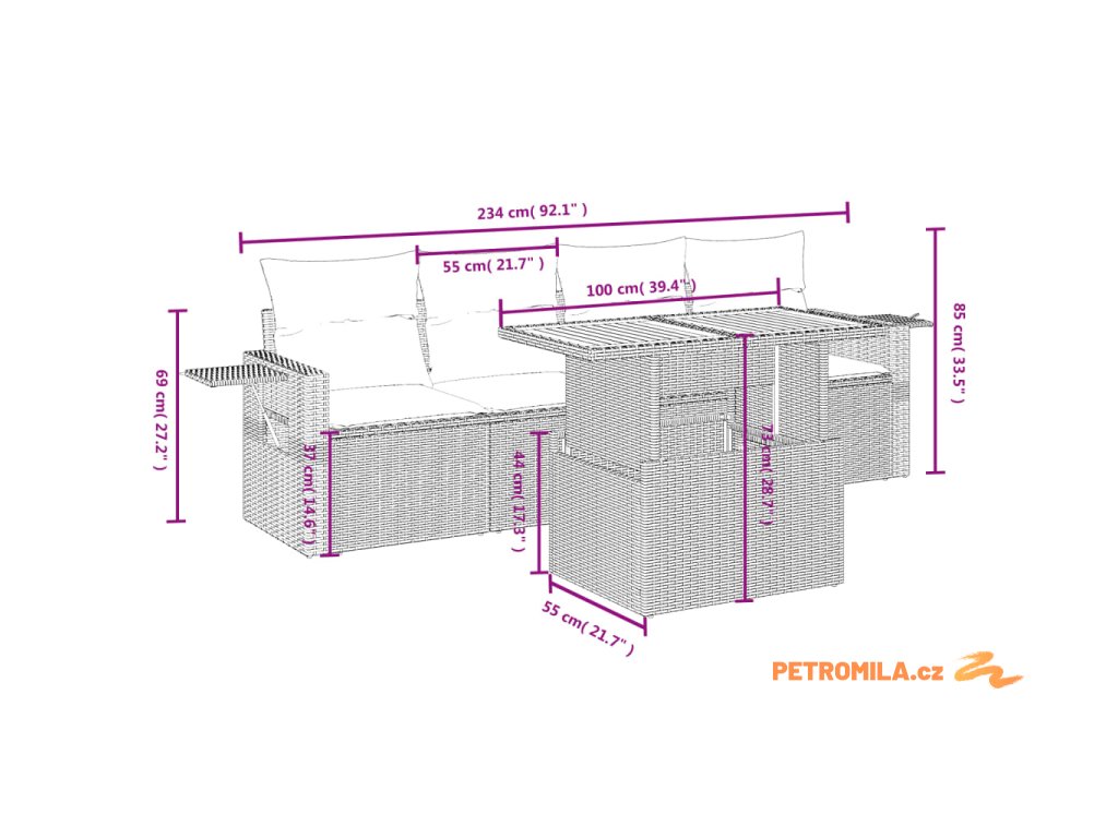 Tato zahradní sedací souprava je dokonalým doplňkem vaší zahrady, terasy nebo dvorku a poskytne vám pohodlné a příjemné místo, kde si můžete povídat s rodinou a přáteli nebo jen tak odpočívat a užívat si pobyt venku.