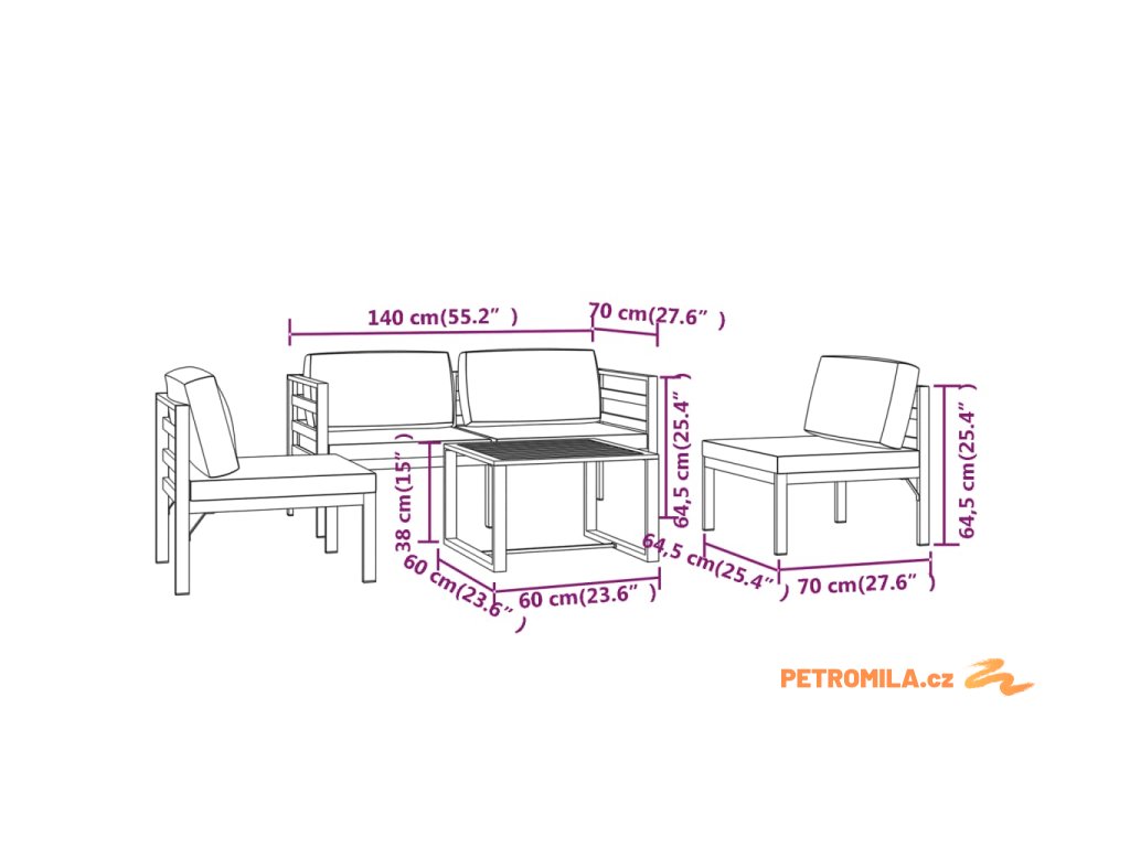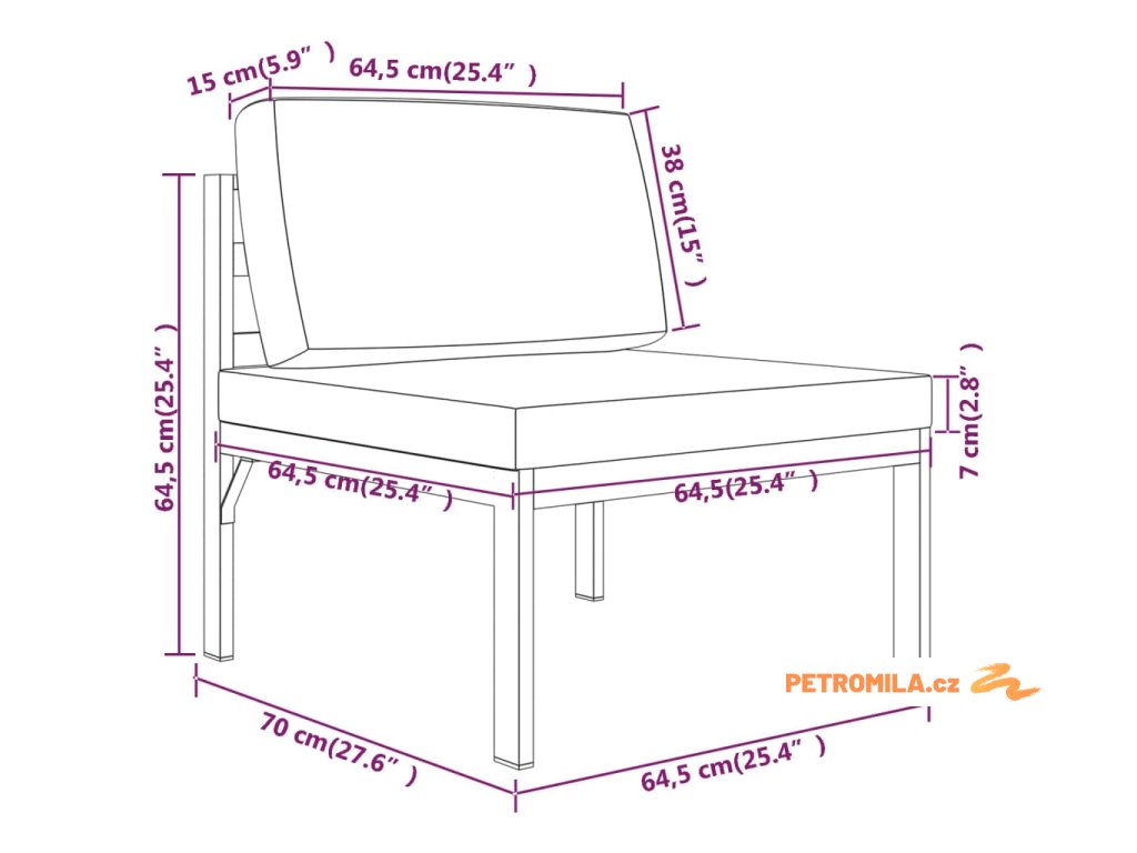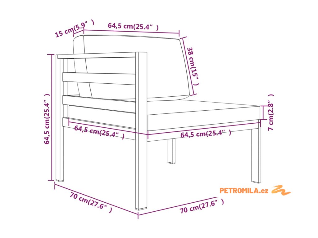 - Rozměry středové pohovky: 64,5 x 70 x 64,5 cm (Š x H x V)