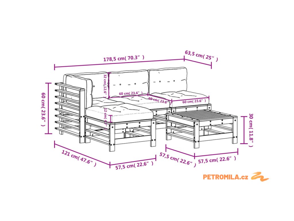 - Rozměry středové pohovky: 57,5 x 63,5 x 60 cm (D x Š x V)