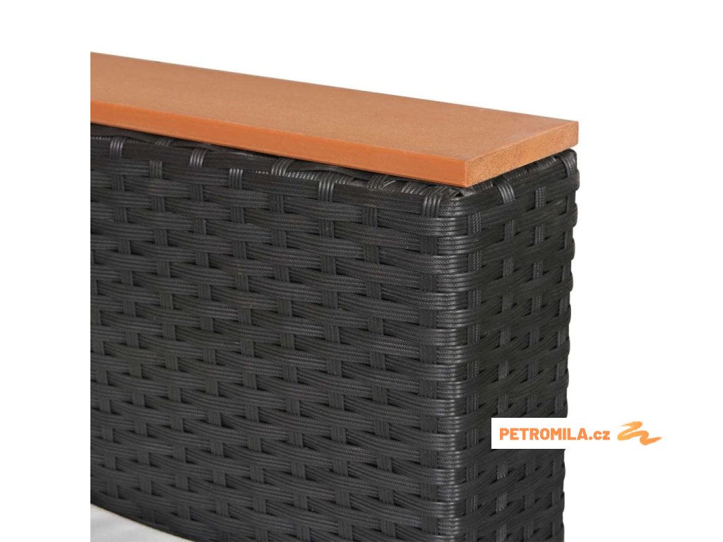 - Materiál: ocelové rámy s práškovým nástřikem + stolní deska a područky z WPC + PE ratan