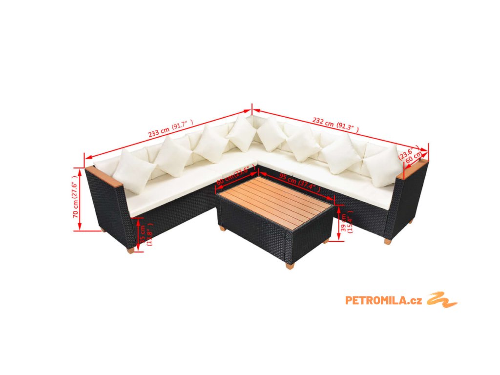 Dodávka zahrnuje dva 2místné pohovkové segmenty (každý s jednou područkou), jeden rohový segment pohovky, jeden 1místný segment pohovky bez područky, jeden konferenční stolek, osm polštářů, osm zádových polštářů a čtyři sedáky. Poznámka: Doporučujeme soupravu za deště, sněhu a mrazu přikrýt.