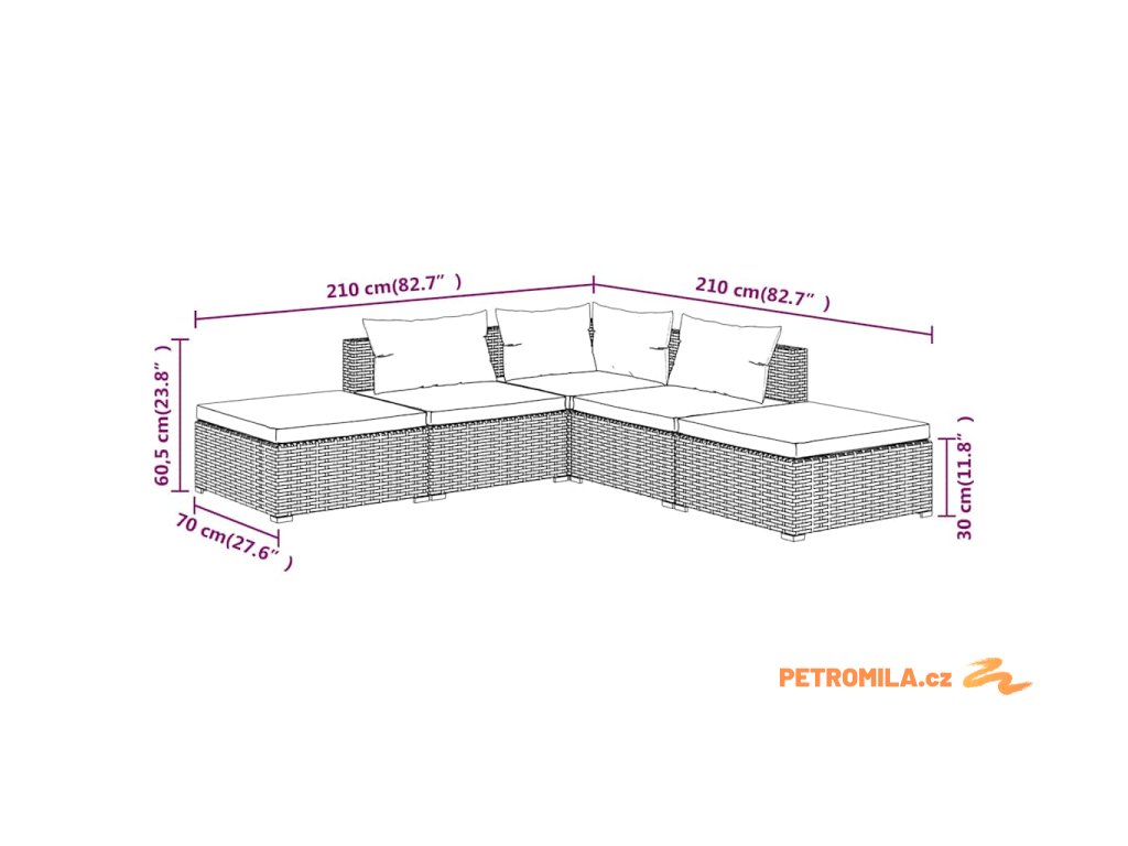 - Rozměry rohové/středové pohovky (každé): 70 x 70 x 60,5 cm (D x Š x V)