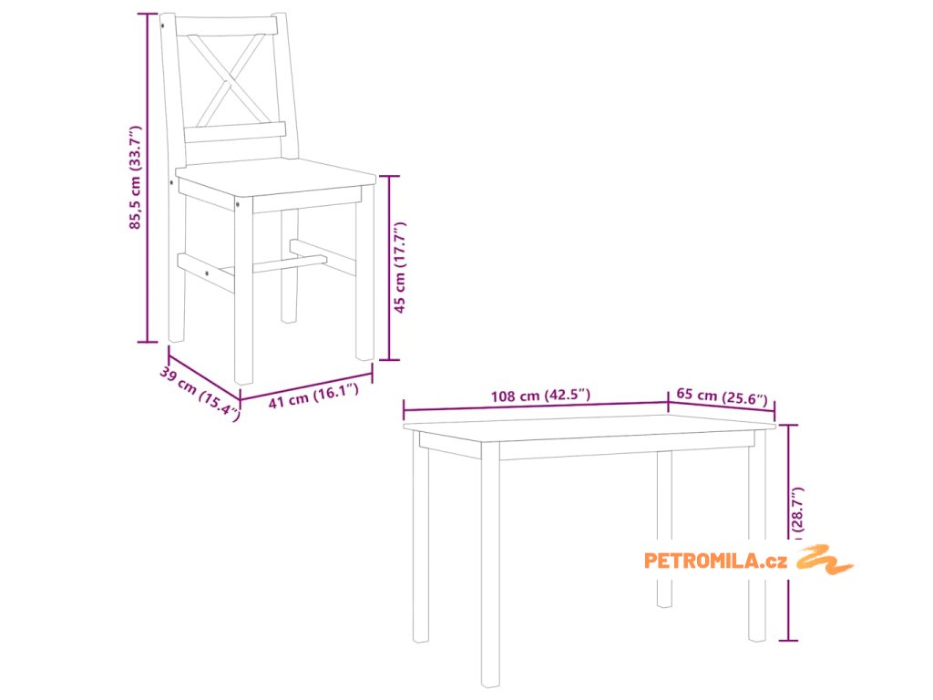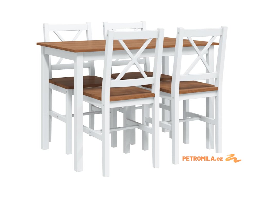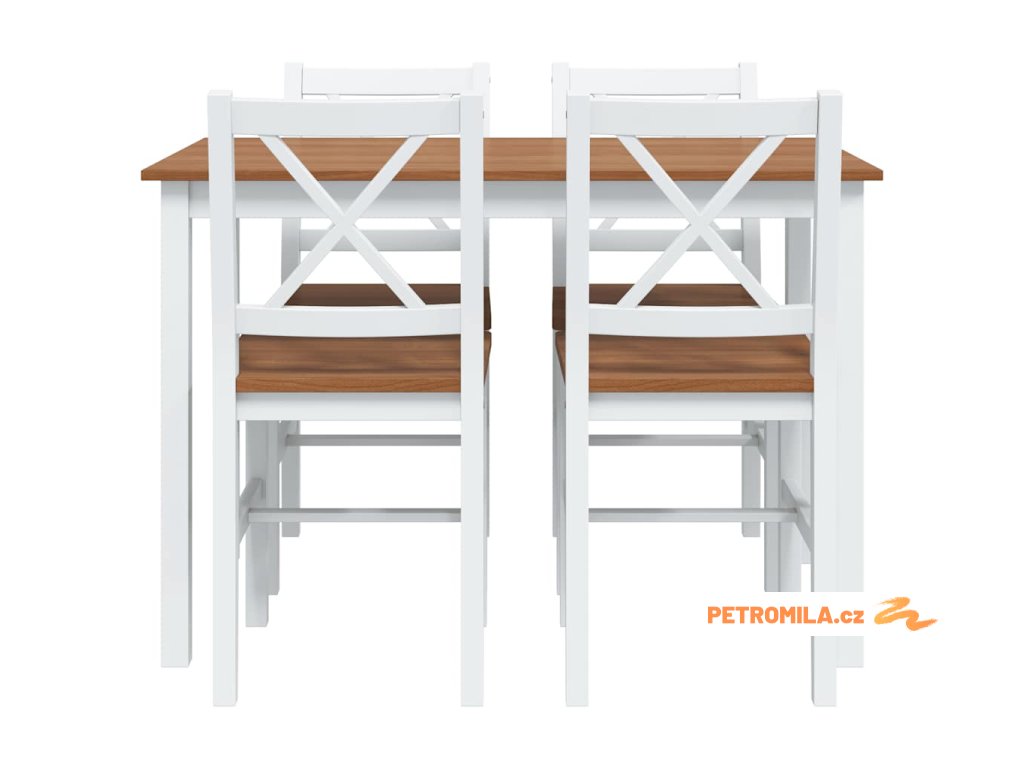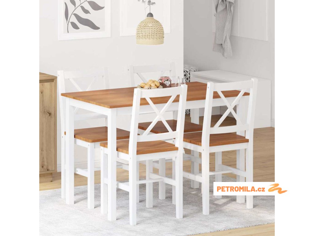 Tento jídelní set je zhotovený z masivního dřeva s atraktivní a elegantní povrchovou úpravou. Kvalita dřeva vám zaručuje roky spokojeného používání. Zásilka obsahuje čtyři židle a stůl.