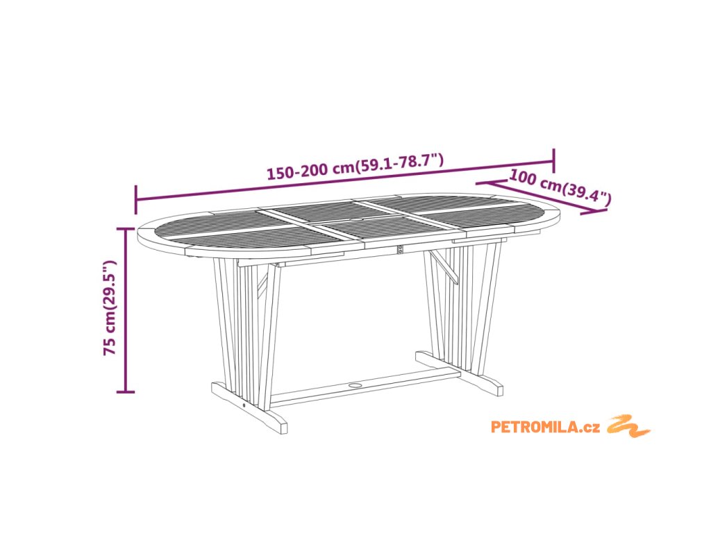 - Rozměry stolu: (150–200) x 100 x 75 cm (Š x H x V)