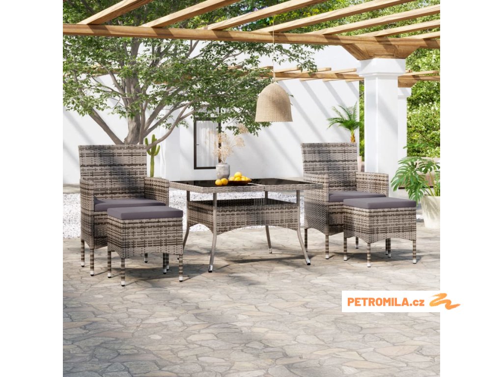 5dílný zahradní jídelní set polyratan a tvrzené sklo šedý