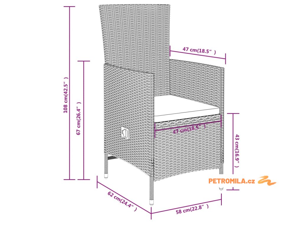 - Rozměry židle (sklopená): 58 x 90 x 91 cm (Š x H x V)