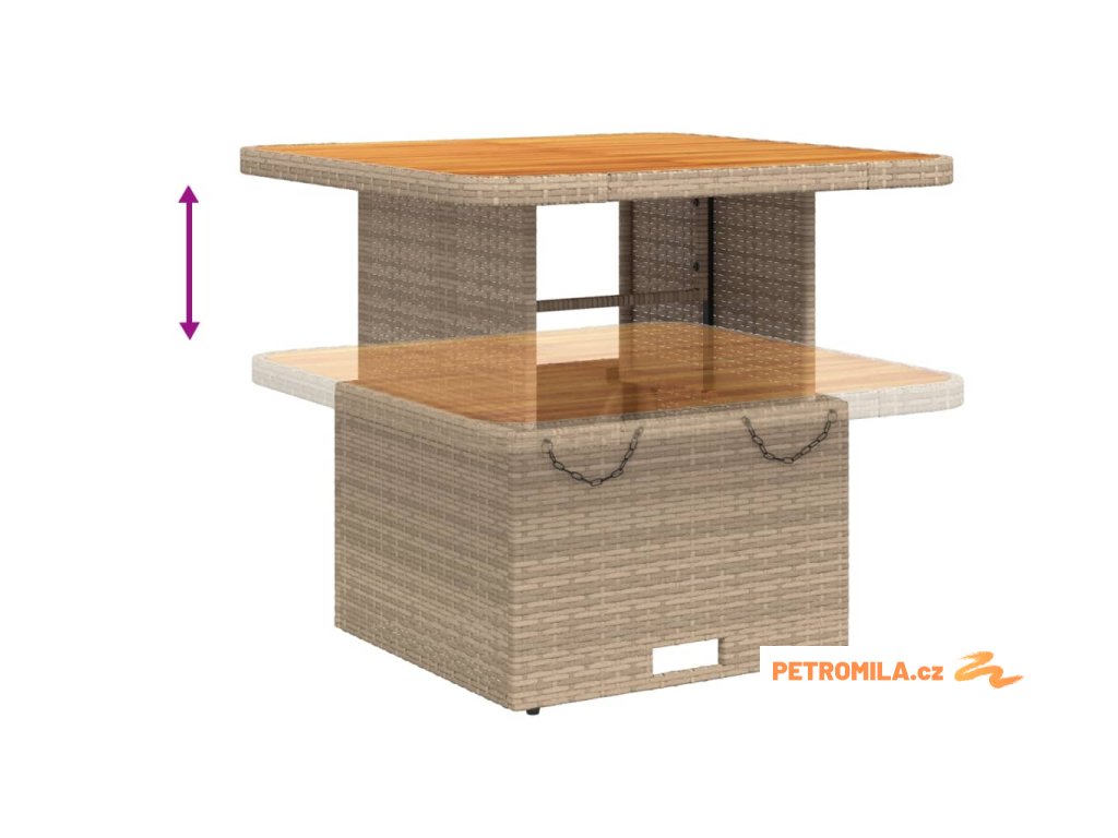 - Nastavitelná deska stolu: Stolní desku lze zvednout tak, aby stůl byl vyšší, takže jej můžete přeměnit z konferenčního stolku na jídelní. Skvěle se hodí pro návštěvy nebo pro stolování venku.