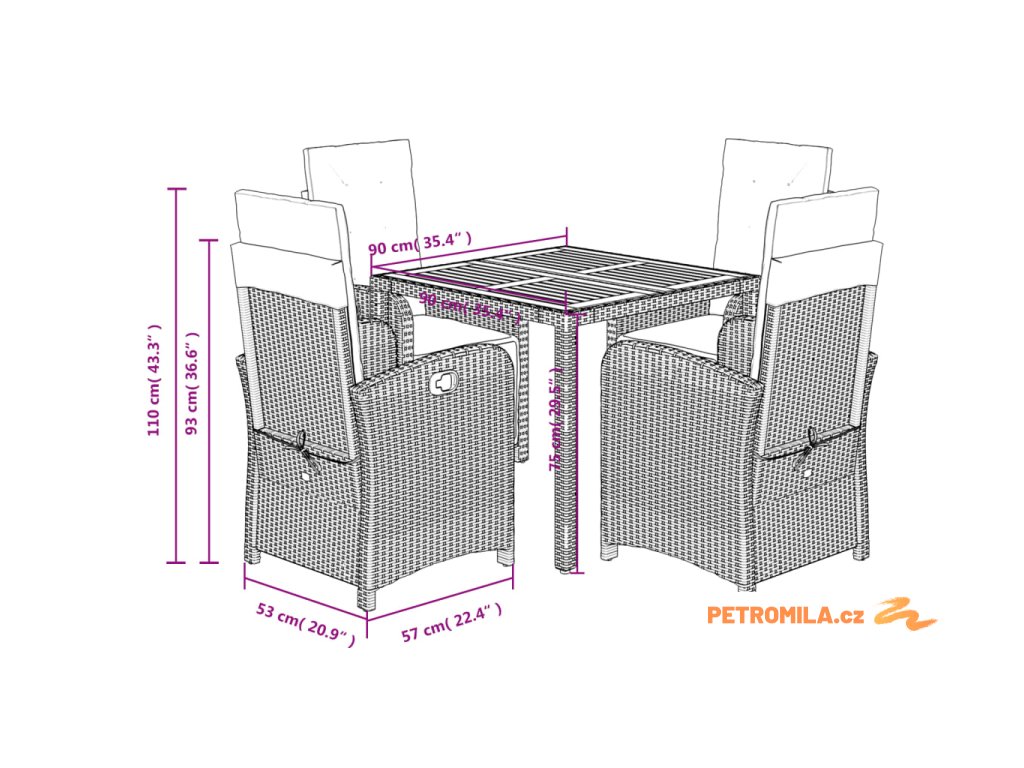 - Materiál: PE ratan, práškově lakovaná ocel, masivní akáciové dřevo
