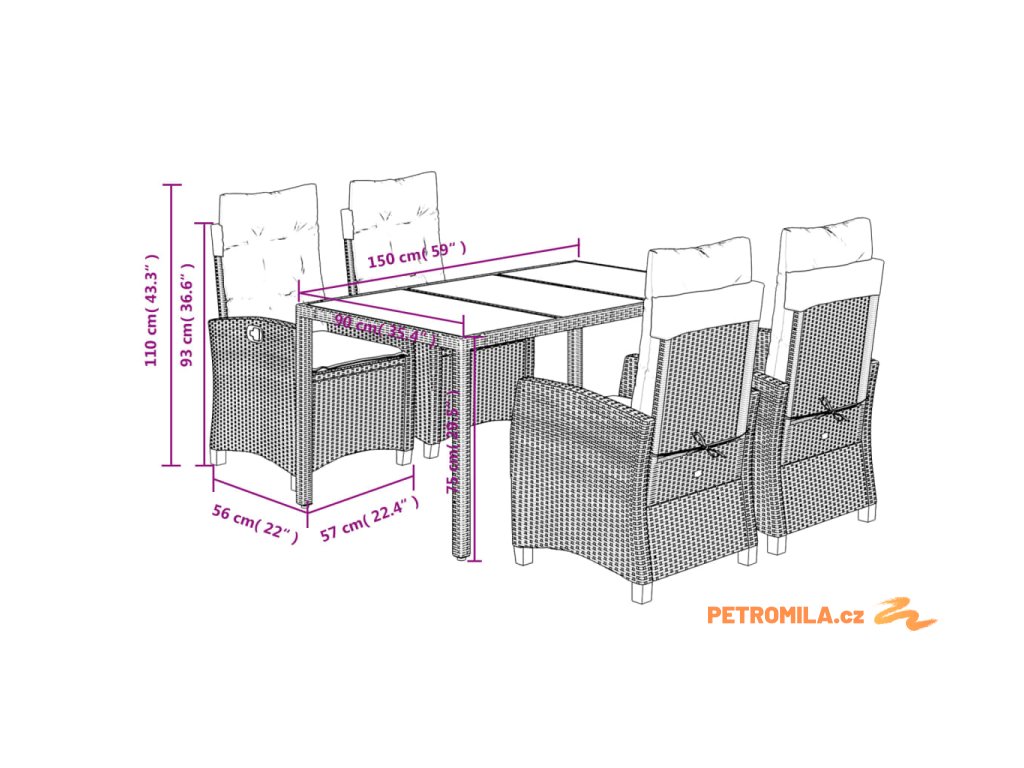 - Rozměry: 150 x 90 x 75 cm (D x Š x V)