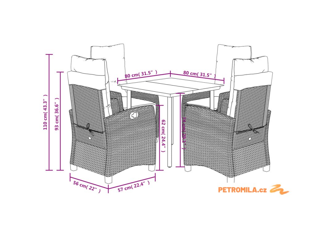 - Rozměry při poloze vsedě: 57 x 66 x 93 cm (Š x H x V)