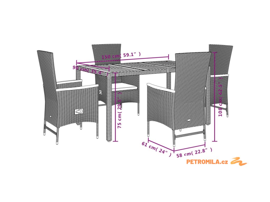 - Materiál: PE ratan, práškově lakovaná ocel, masivní akáciové dřevo s olejovou povrchovou úpravou