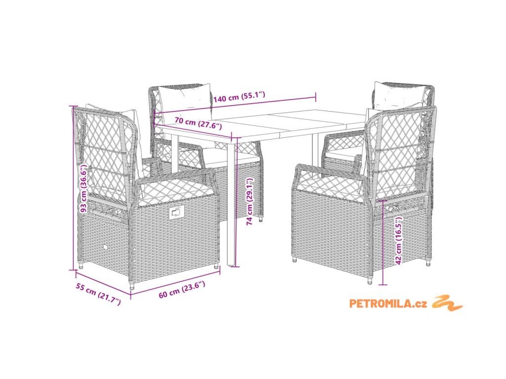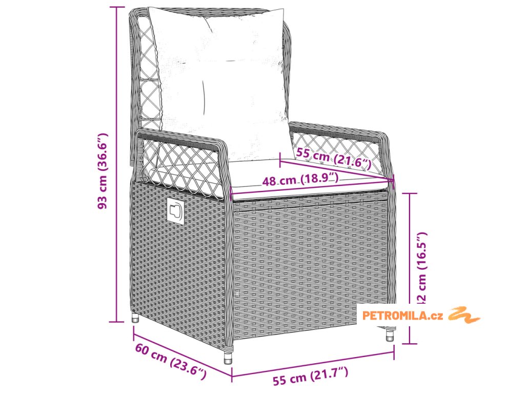 - Rozměry při poloze vsedě: 55 x 60 x 93 cm (Š x H x V)