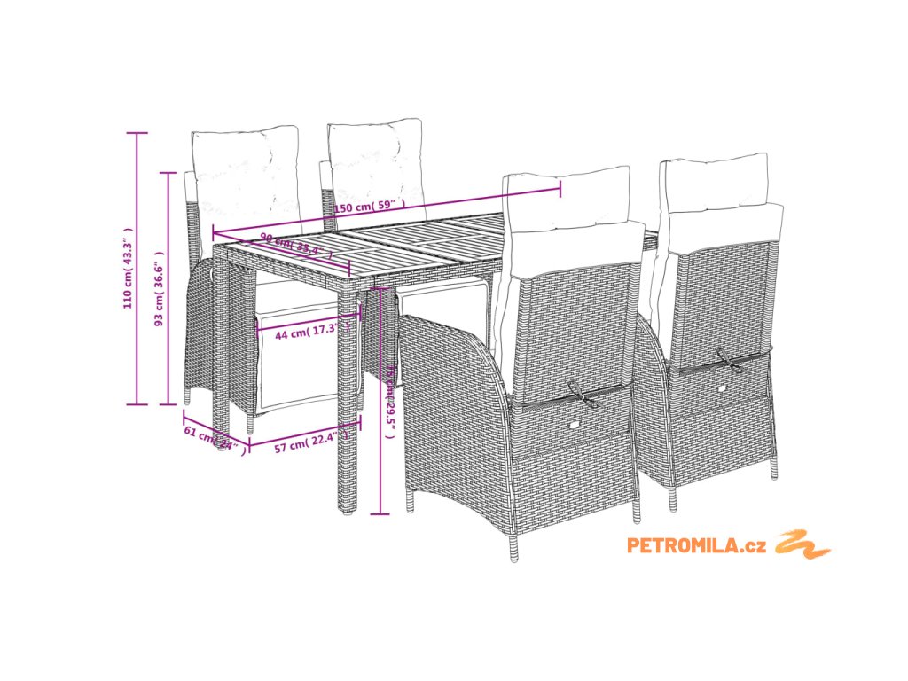- Materiál: PE ratan, práškově lakovaná ocel, masivní akáciové dřevo s olejovou povrchovou úpravou