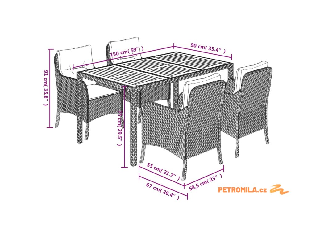 - Materiál: PE ratan, práškově lakovaná ocel, masivní akáciové dřevo s olejovou povrchovou úpravou