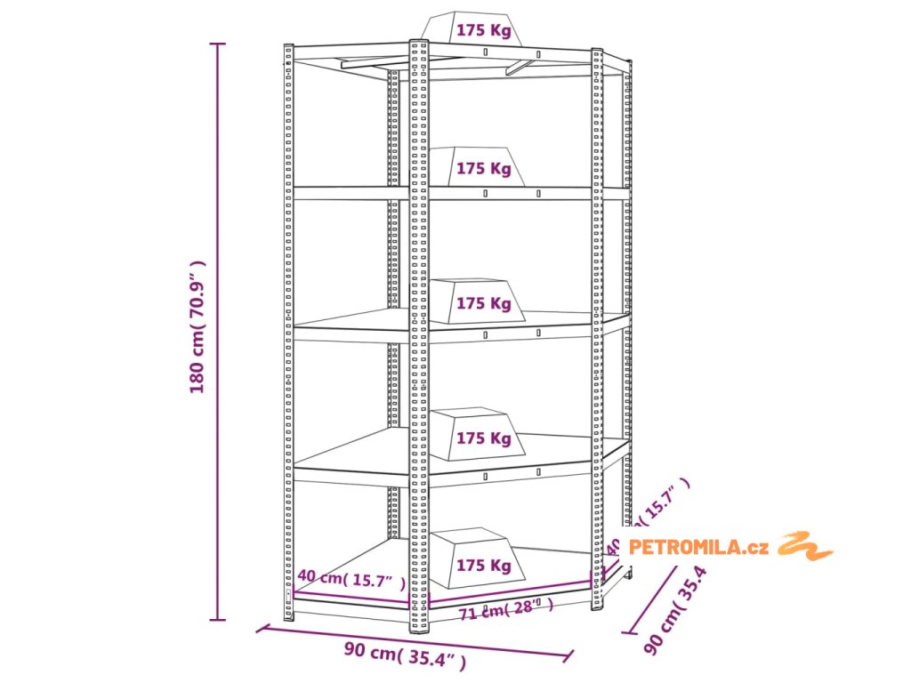 - Vysoká nosnost: Vzhledem k silnému materiálu, výztužným tyčím pod každou policí a konstrukci bezšroubových polic má regál výjimečně vysokou nosnost.