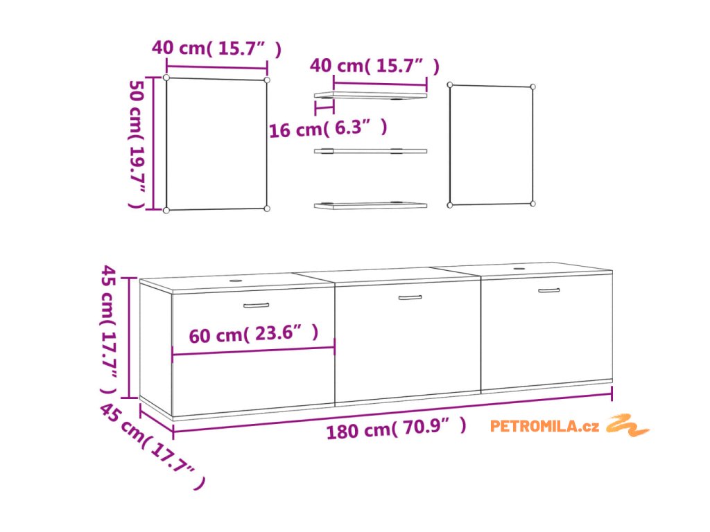 - Rozměry nástěnné skříňky pod umyvadlo: 180 x 45 x 45 cm (D x Š x V)