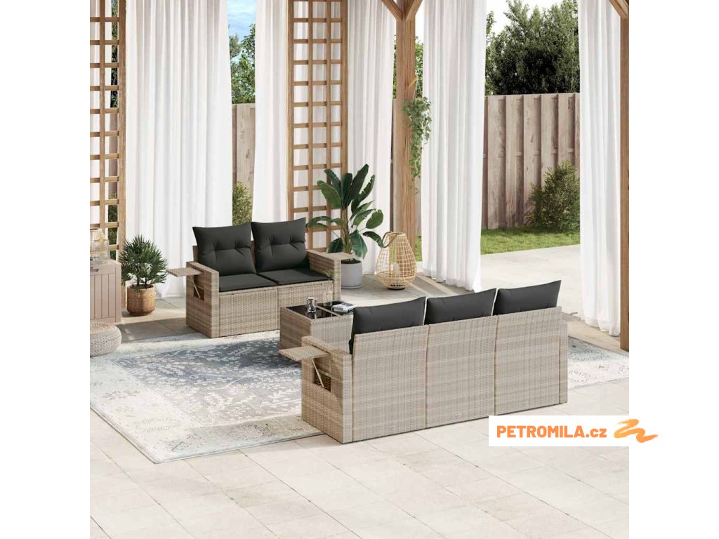 6dílná zahradní sedací souprava a podušky světle šedá polyratan