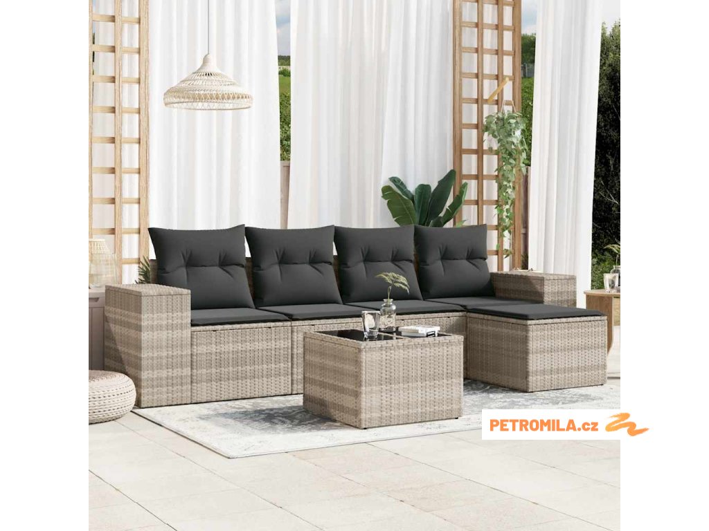 6dílná zahradní sedací souprava a podušky světle šedá polyratan