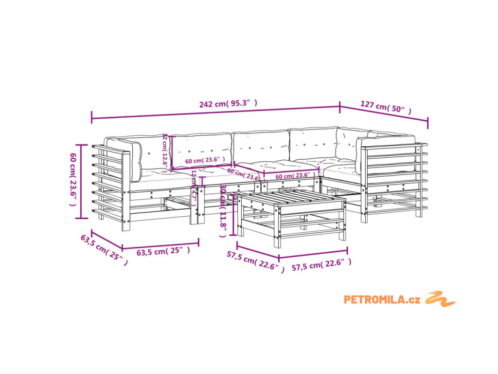 - Rozměry středové pohovky: 57,5 x 63,5 x 60 cm (D x Š x V)