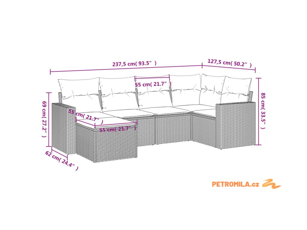 - Rozměry podušky za záda: 55 x 45 x 13 cm (D x Š x T)
