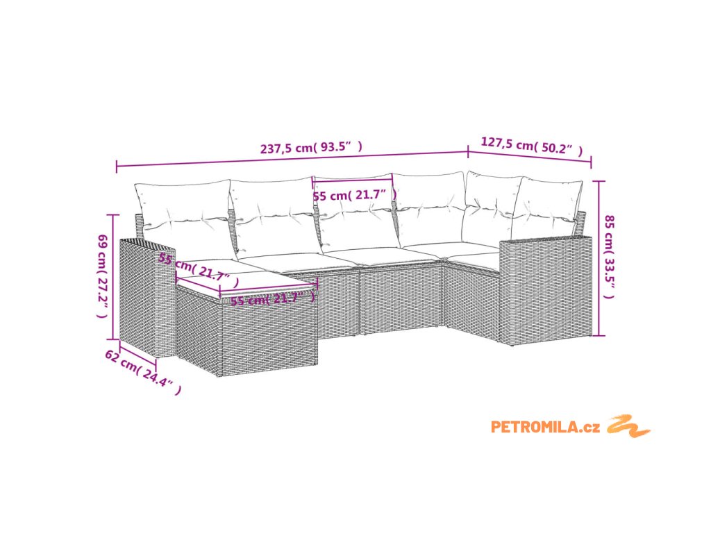 - Rozměry podušky za záda: 55 x 45 x 13 cm (D x Š x T)