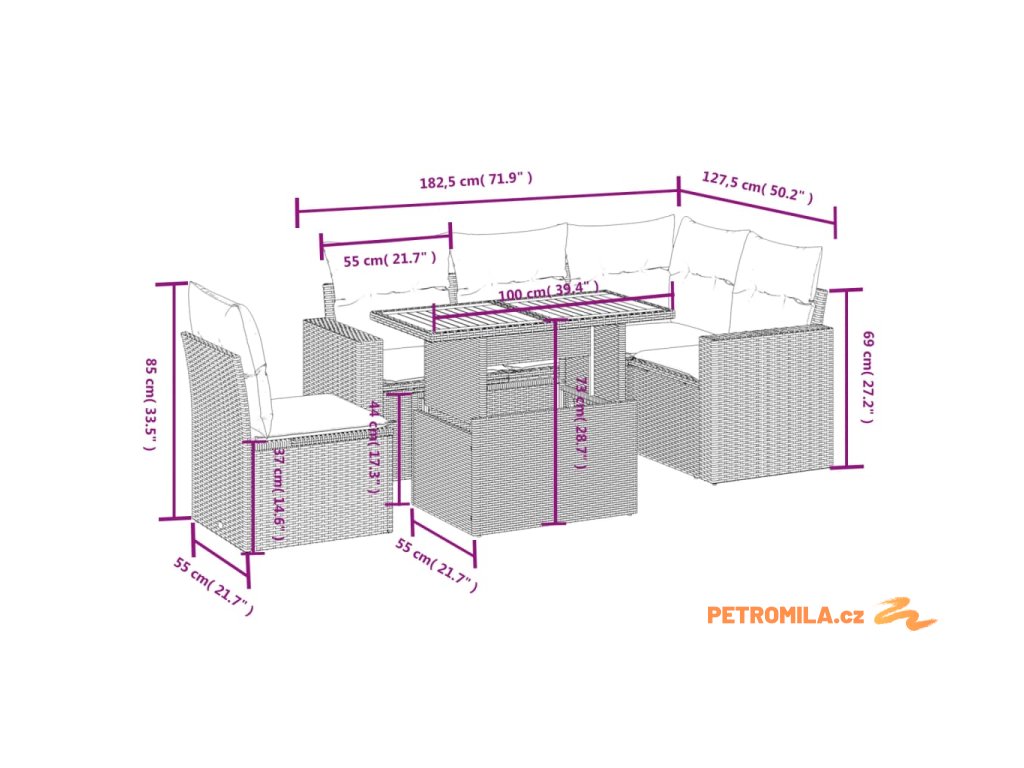 - Rozměry: 100 x 55 x 44/73 cm (D x Š x V)