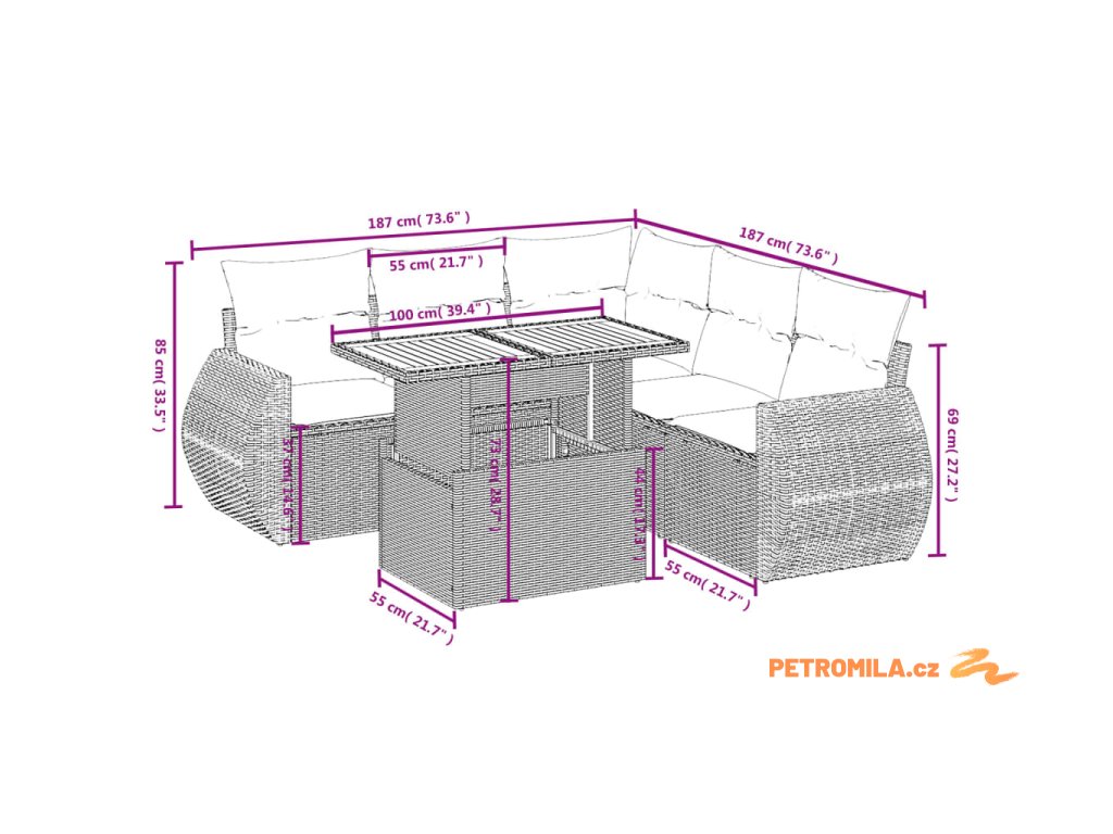 - Modulární design: Tato sada venkovního nábytku se vyznačuje modulární konstrukcí, je tedy zcela flexibilní a lze ji snadno přemisťovat, takže si můžete uspořádat venkovní nábytek dle vašich potřeb.