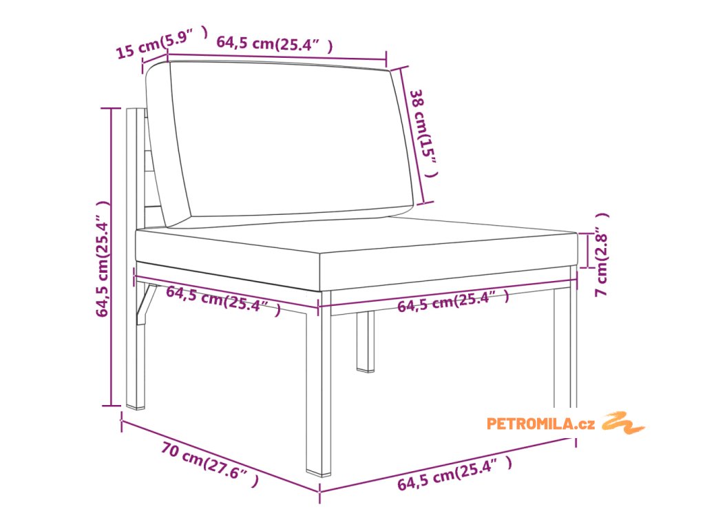 - Rozměry středové pohovky: 64,5 x 70 x 64,5 cm (Š x H x V)